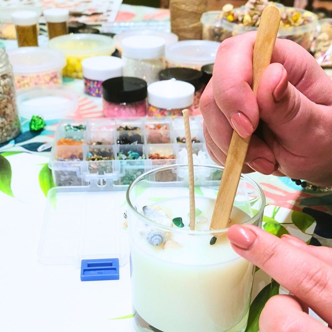 🕯️ Une petite bougie parfumée, décorée de fleurs séchées, paillettes, stickers…