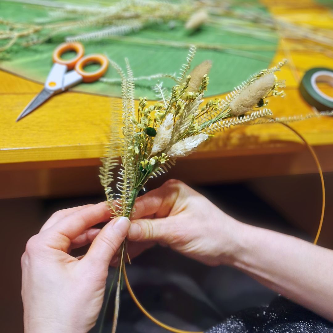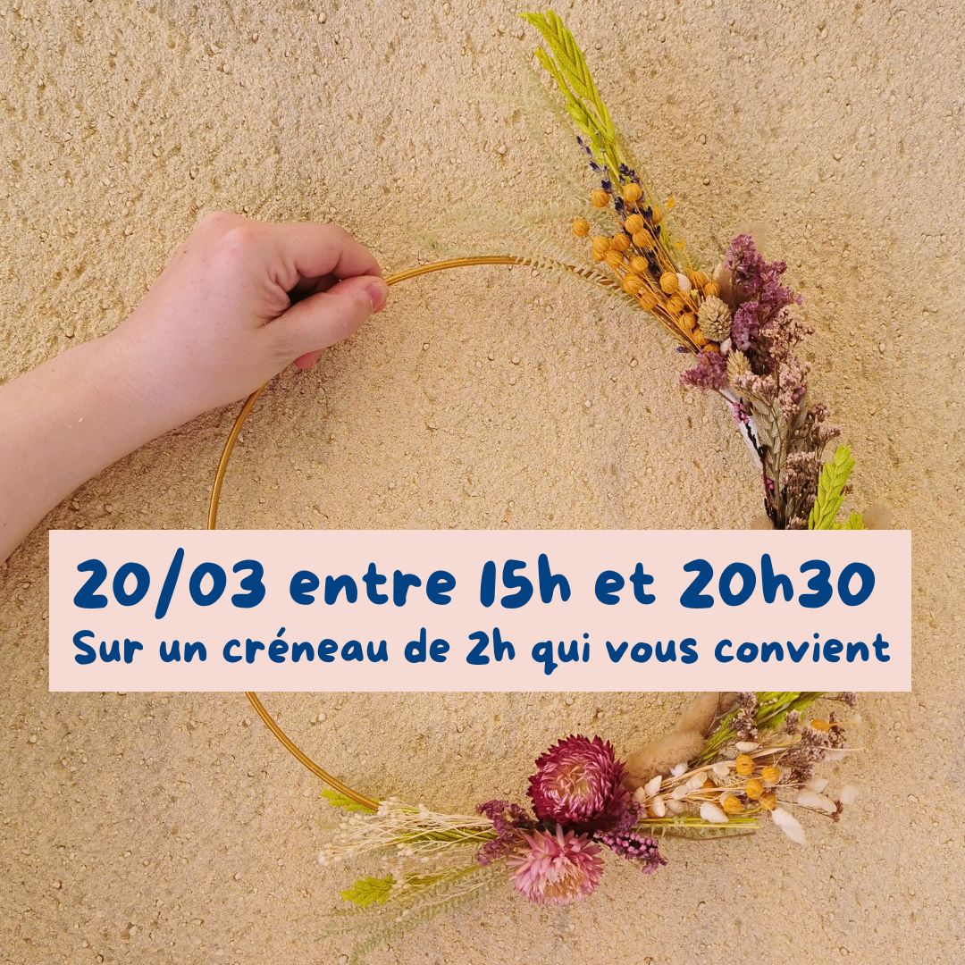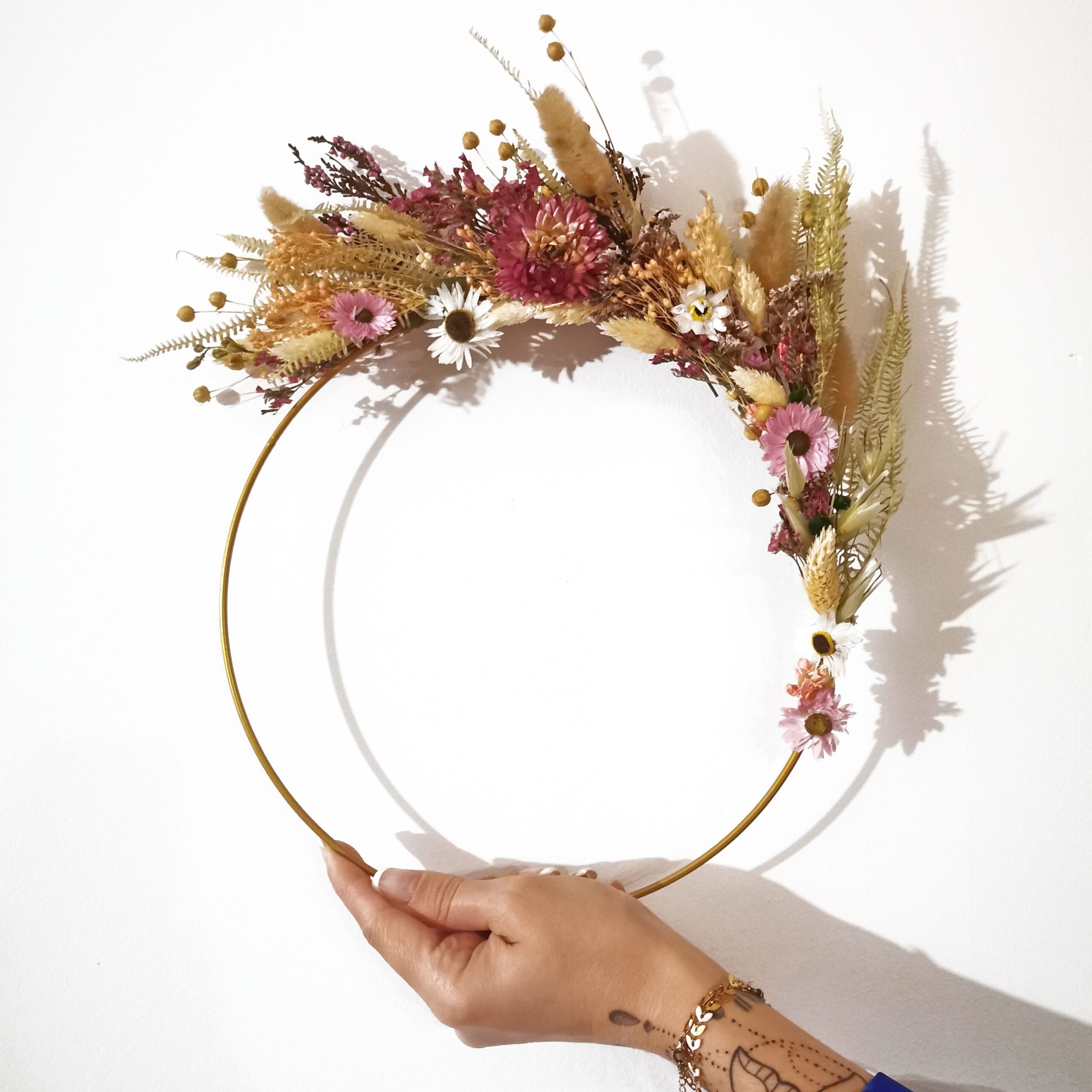 Cet atelier vous permettra de réaliser une superbe couronne murale à base de fleurs séchées fixées sur un cercle doré.