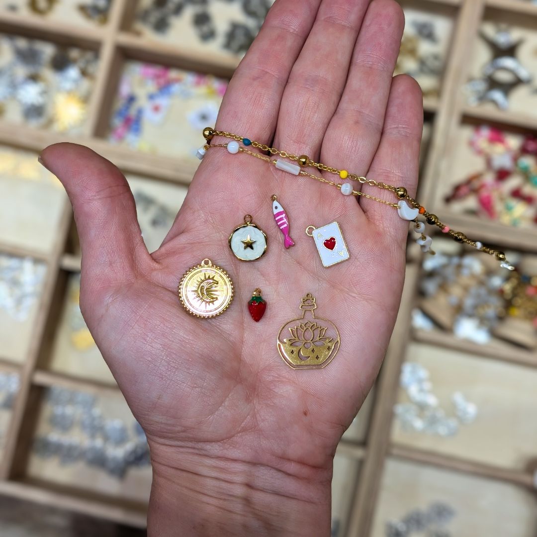 - Tes charms : pampilles pleines de sens ou de fantaisie. Lune, étoile, fleur, animaux… tu laisses parler ton intuition !